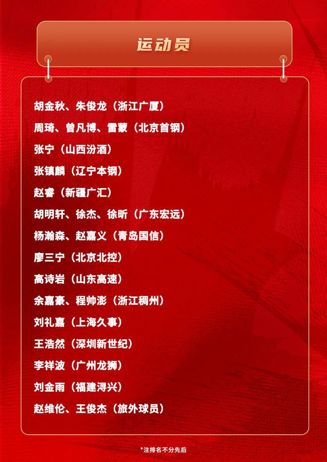 这份新出炉的名单包括新科中国男子篮球职业联赛(CBA)总冠军浙江广厦队的胡金秋和朱俊龙,获得联赛亚军的北京首钢队有周琦、曾凡博和雷蒙3人入选。此外,名单中还有张镇麟、赵睿、胡明轩、徐杰、余嘉豪等国家队常客以及杨瀚森、赵嘉义、刘礼嘉、王浩然、刘金雨等年轻新锐,旅外球员赵维伦和王俊杰也榜上有名。